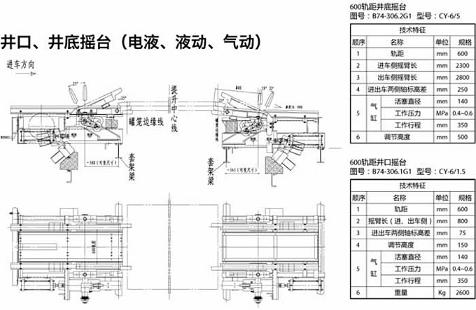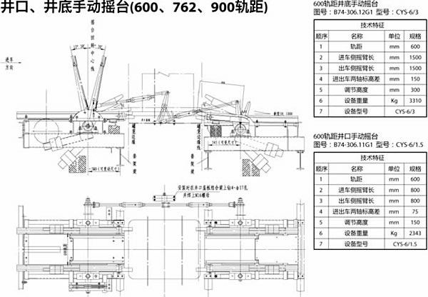 搖臺為一段可擺動軌道,一端繞固定軸擺動,另一端當罐籠停好后搖尖搭接在罐籠邊緣的導軌襯上, 搖臺邊接了罐內(nèi)與車場中的軌道, 搖臺便于礦車進出罐籠。當搖臺抬起時, 搖臺上***突出部的外形與罐籠間留有足夠的安全間隙。搖尖的前端,工作時與罐內(nèi)導軌襯搭接,搖尖鉸接在搖臂上,可以自由轉(zhuǎn)動一定的角度,搖尖的尾部設(shè)有配重,使其前部經(jīng)常處于抬起狀態(tài)。當由于事故搖臺放下后,罐籠通過時,搖尖頭部被撞向下旋轉(zhuǎn),而允許罐籠安全通過。搖尖和導軌襯的結(jié)構(gòu)保證了搖臺與罐籠搭接時,側(cè)向能可靠定位,從而罐籠內(nèi)外軌道不會錯位,免發(fā)生礦車掉道事故。