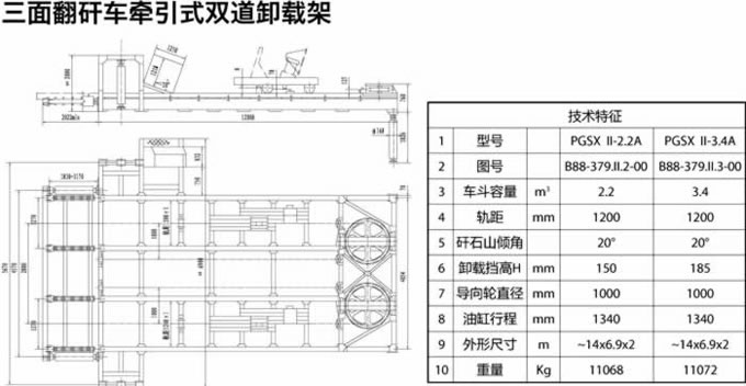三面翻矸車用途: 排矸系統(tǒng)設備適用于矸石山裝卸矸石用。其生產工序為:重車出井由電機車推至翻車機車間,通過裝載扇形閘門卸入裝載設備,由絞車牽引至卸矸架卸矸,卸矸完成后絞車反轉,裝載設備行至裝載扇形閘門下部等待下一工序。