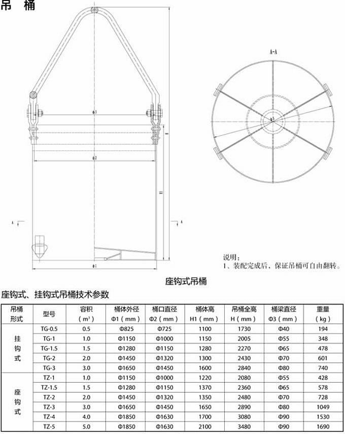 使用范圍及特點: 吊桶是立井井筒開鑿期間提升矸石、升降人員和材料的主要容器。當(dāng)井筒涌水量小于6m3/h時,還可作排水用,根據(jù)卸矸形式不同吊桶分為掛鉤式吊座鉤式吊桶。 座鉤式,掛鉤式吊桶技術(shù)參數(shù)
